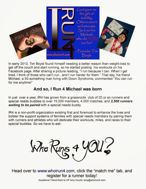 I am now at number 1302 on my quest to find a buddy to run dedicate my runs. If you are looking for a pick-me up for you or your child please consider signing up! There is NEVER a cost to join. You can register at Who I Run 4
